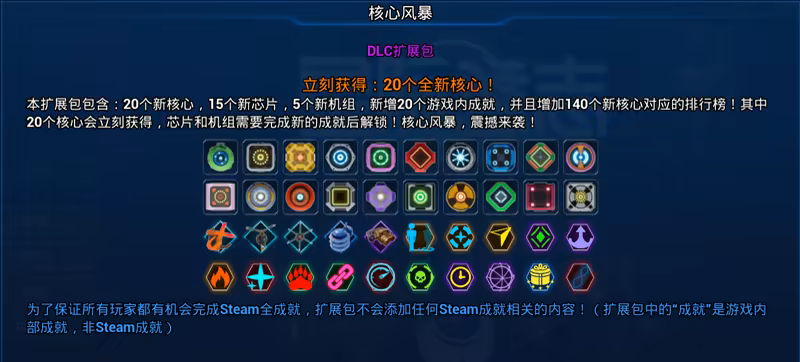 本擴展包包含:20個新核心,15個新芯片,5個新機組,新增20個遊戲內成就!其中20個核心會立刻獲得,芯片和機組需要完成新的遊戲內部成就後解鎖!核心風暴,震撼來襲!