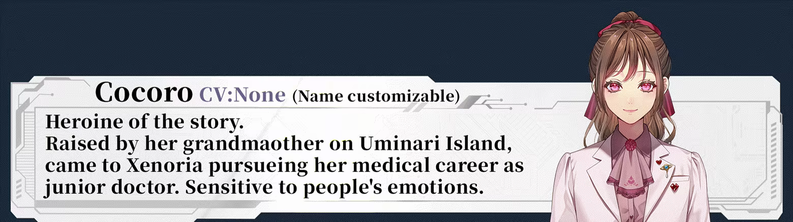 Cocoro, our main heroine, was born in a small island. After graduating from college, she came to Xenoria looking for a job.