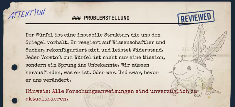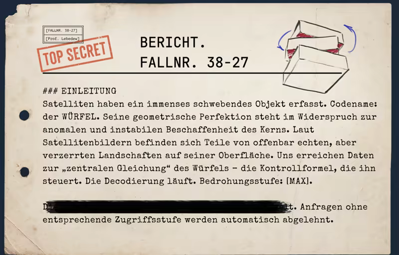 The CUBE ist ein MMO-RPG-Shooter. Ein gewaltiger schwebender Würfel mit sich drehenden Kanten und Seitenflächen. Im Inneren verbirgt sich eine unbekannte Gleichung, die die Naturgesetze auf den Kopf stellen kann. Überlebst du die nächste Drehung?