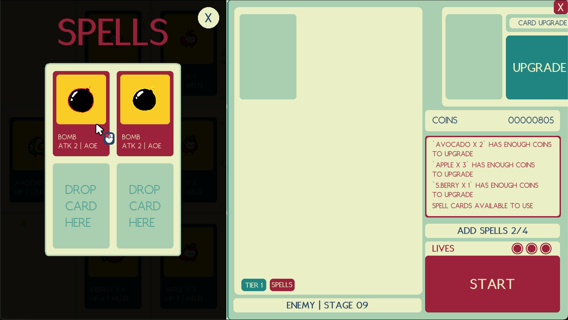 If you’ve got a fruit card you like, you can spend some coins. That just means it’ll summon more units. (Sadly, spells don’t upgrade—but they’re strong already.)