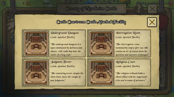 From the stained glass of the chapel to the underground dungeons of the courthouse... Choose your castle annex facilities considering the natural environment and buildings of your castle!