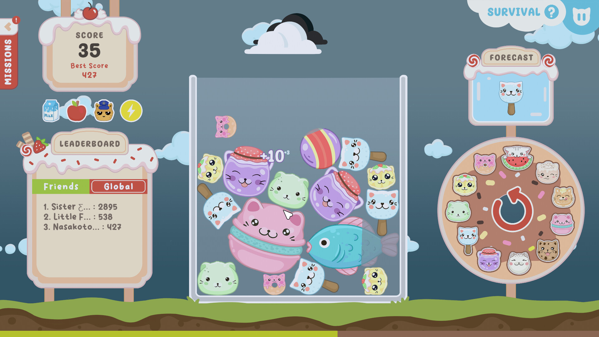 Merge adorable dessert-shaped cats to create larger felines, all the way up to the ultimate cat-ermelon! Collect points to unlock exciting power-ups and customize your gameplay. Play casually for fun or take on challenges as you navigate obstacles and changing weather conditions.