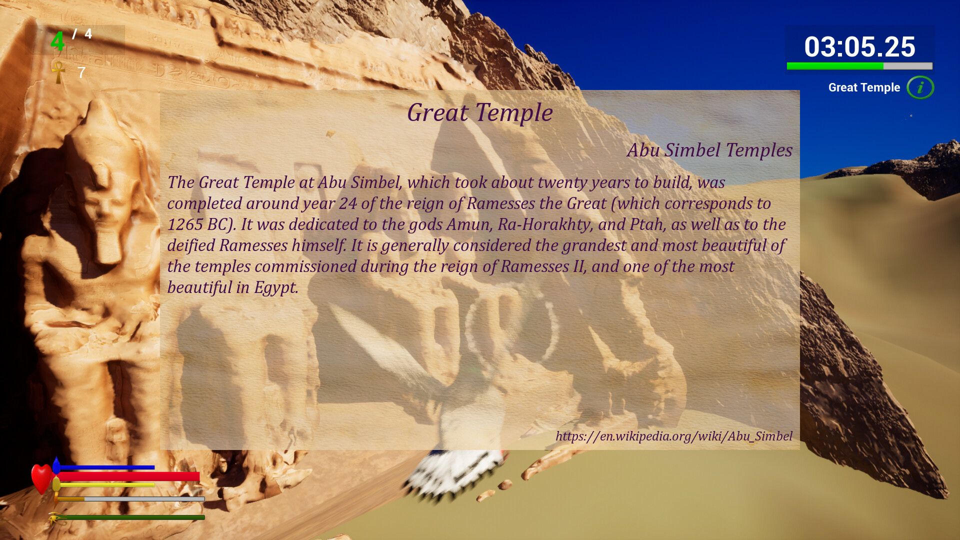 A pigeon racing game (Checkpoint system) the race passes through ancient Egyptian historical sites (Abu Simbel, Philae, Edfu, Luxor, Karnak, Hatshepsut, Dendera, Abydos and Pyramids).