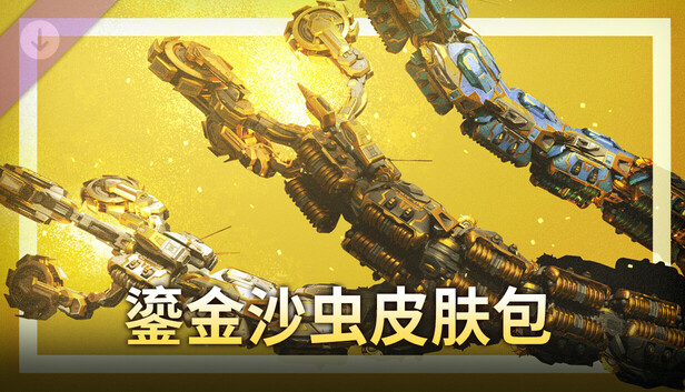 此皮肤包内含 3 件皮肤,适用于‘沙虫’机甲,给它镀上一层金色,再加一点颜色变化。