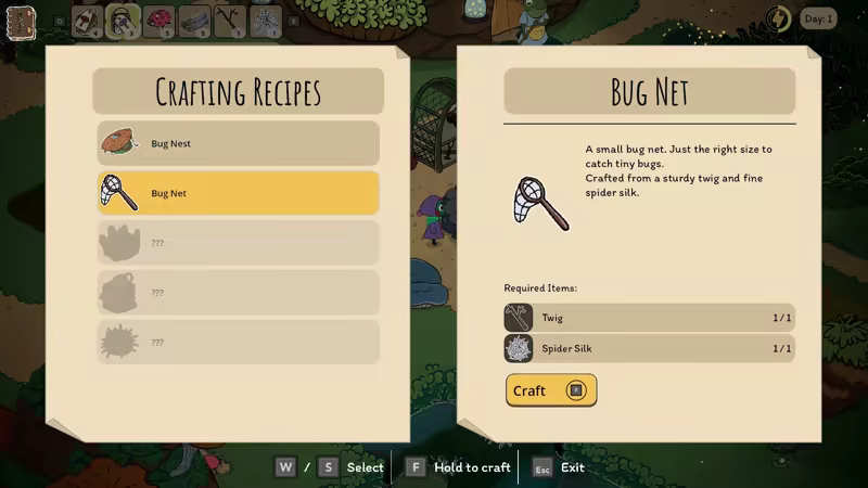 The player can advance to the next part of the day when they feel ready. Explore and craft during the day.
