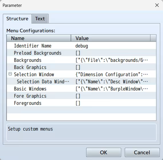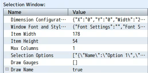 Setup the dimension configuration to control the size and position of the selection window and the Window Font and Style for the font settings and window skin/opacity.