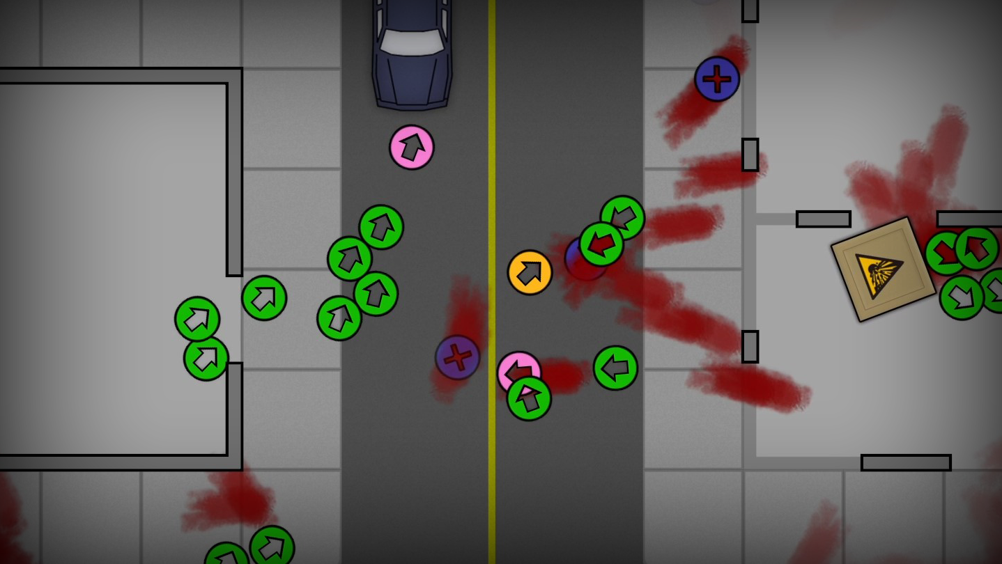 The game is set in procedurally generated and entirely destructible cities. Overflowing with both ravenous zombies (represented by green circles with an arrow pointing in the direction they're facing) and fleeing human NPC survivors (represented by a pink circle). Along with being able to dynamically destroy every wall you see, there are also destructible cars and crates (some of which will heal you when you break them open while others will explode).