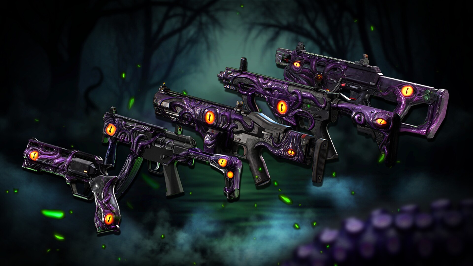 Wrap your weaponry in nightmarish creatures. You know what they say, one can never have enough eyes on your weapons! These skins feature paranormal green muzzle flashes and extra punchy, slightly eerie sounds, and lovecraftian vibes.