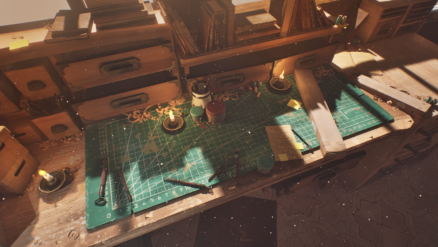 • THE ANIMATOR moves around the miniature sets of their studio in first-person view. They manipulate the set pieces to clear a path for the puppet.