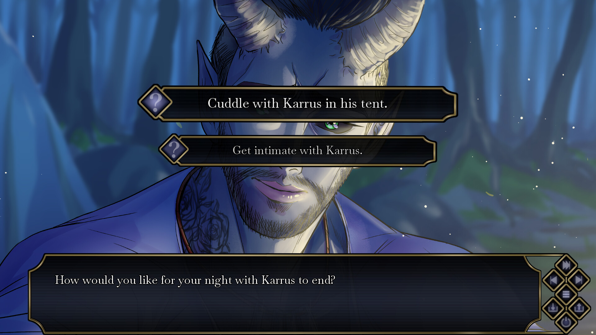 You're then quickly joined by Karrus, a handsome Tiefling who you harbor feelings for. With this potentially being your last night with Karrus, how will you spend it?