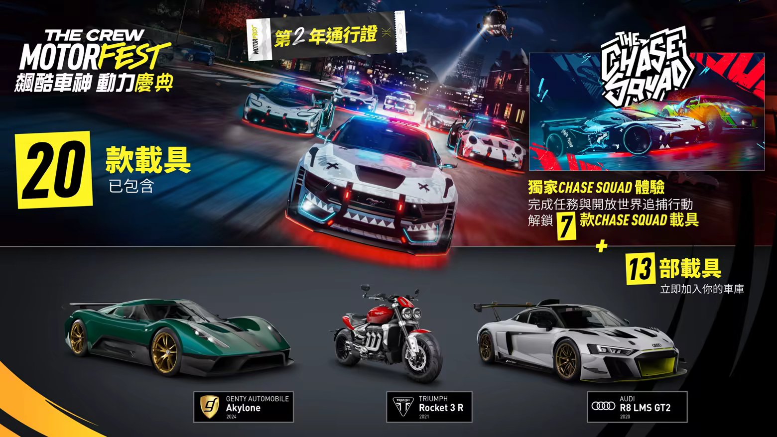 - 「Chase Squad」體驗:於獨家遊玩清單追捕目標,接下新的開放世界挑戰。阻止所有對手,解鎖 7 款獨家 Chase Squad 載具:6 款車輛以及 1 台直升機,附帶獨特自訂內容。閃光燈、底盤燈、特殊烤漆——工具在手,加入 Motorfest 守護者的行列吧。