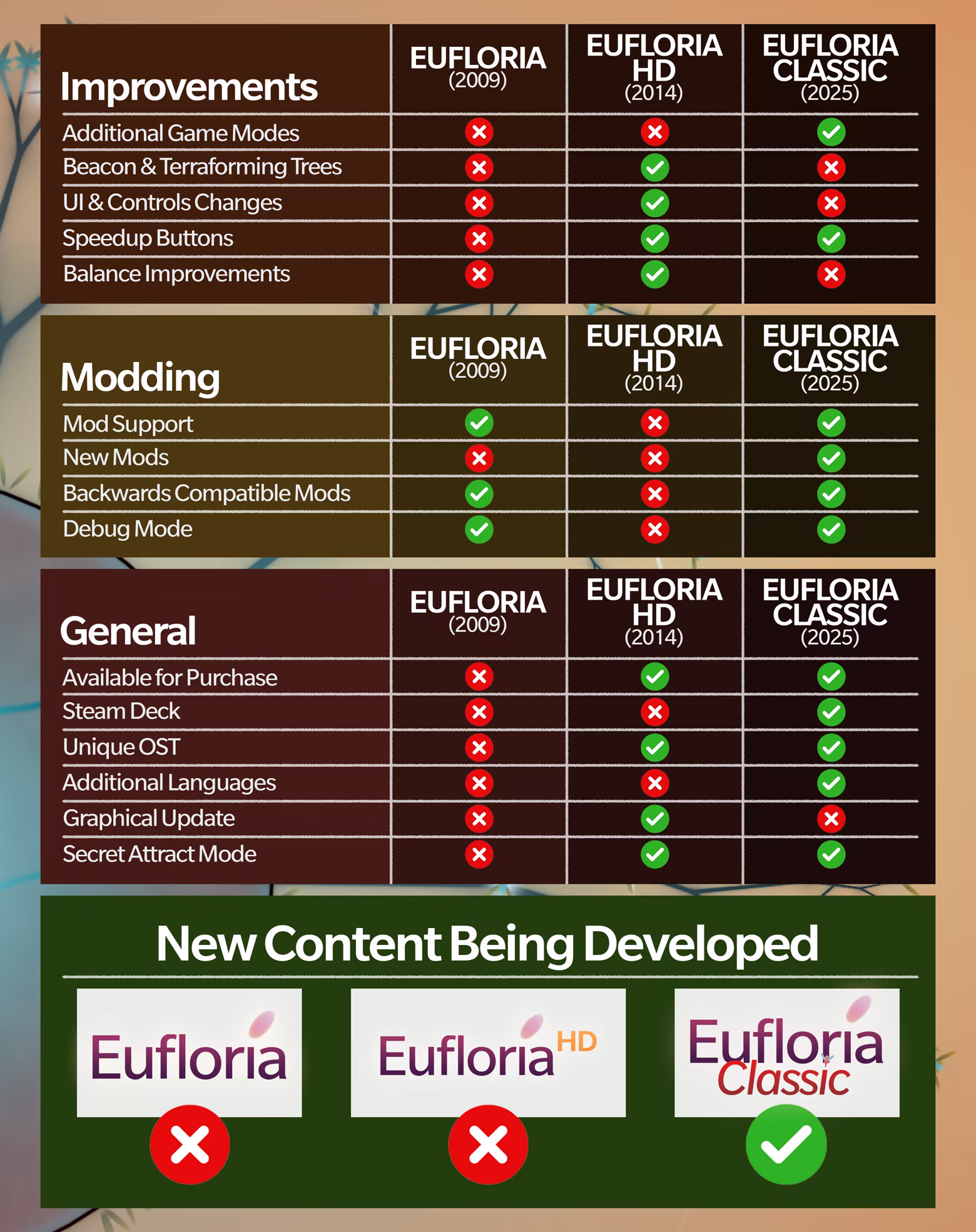 Eufloria Classic is een heruitgave van de originele versie van Eufloria (2009), met enkele moderne kwaliteits-van-leven verbeteringen. Het is geen nieuwe Eufloria-game en ook geen vervolg op Eufloria HD (2014). Het is een jubileumuitgave “met alle gebreken”, waarbij alleen niet-ingrijpende veranderingen of objectieve verbeteringen zijn aangebracht. Alles wat het “gevoel” van de originele Eufloria beïnvloedt, is onveranderd gebleven.