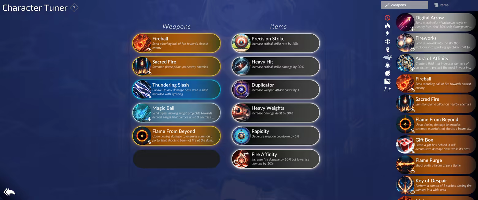 No two runs play out the same. Every choice you make: which weapons to pick? which elements to combine? which items to sacrifice HP for? Shapes a build that either holds together under pressure or falls apart when the waves stop giving you room to breathe.