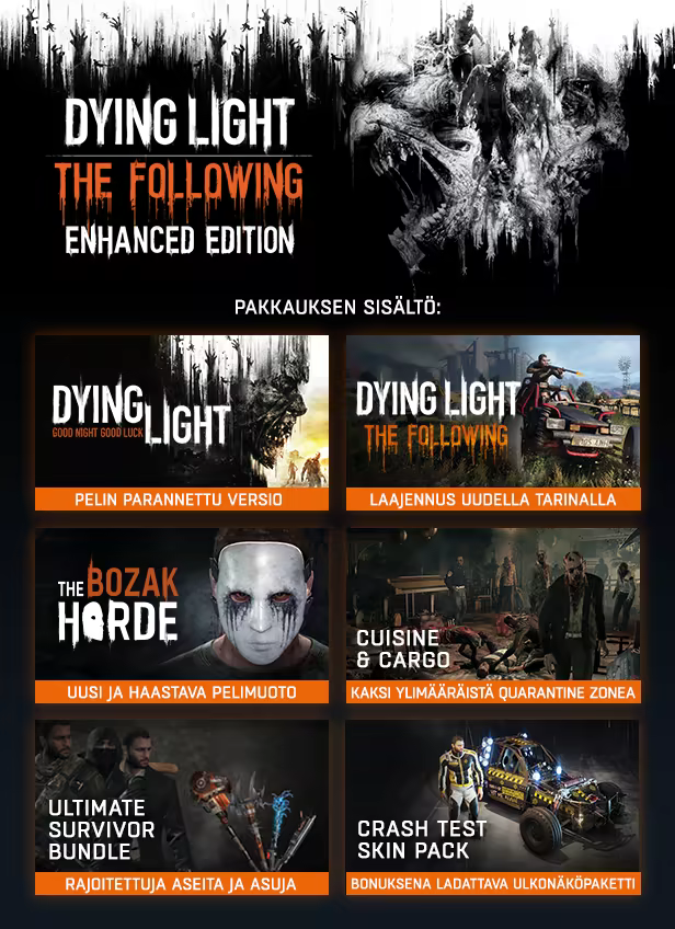 Dying Light: The Following – Enhanced Edition on täydellisin avoimen maailman zombipeli. Se on saatavana nyt, kokonaisimmassa muodossaan, mikä parantaa pelikokemuksen täysin uudelle tasolle.