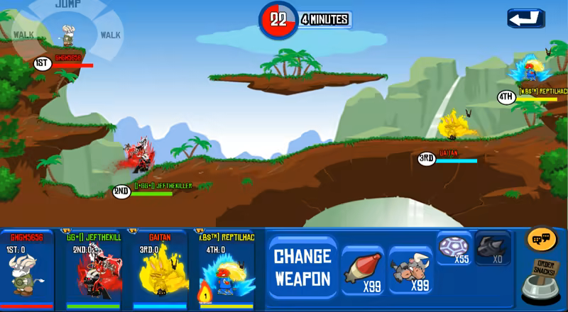 The game takes place in a series of vibrant and diverse scenarios, from tropical islands to icy glaciers, each with its own unique characteristics and challenges. Players can move through these environments using jumping and movement skills while attempting to evade enemy attacks and strategically position themselves to counterattack. Wild Ones Battle Stadium is a turn-based 2D game where players control animals in battles, earning points, coins, and experience. Customize with gear and pets, join clans, and compete in modes like Battle Royale. Enjoy intense multiplayer action, daily rewards, and a social system with friends.