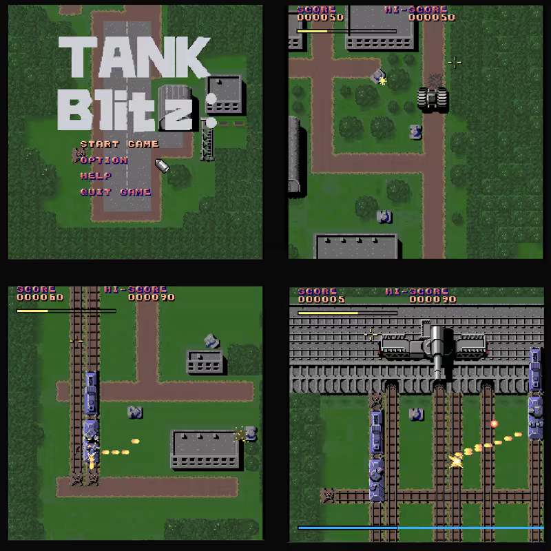 Tank Blitz:  is a retro-style 2D top-down tank shooter where you engage in intense battles against a variety of enemy tanks, armored trains, and devastating railguns. Utilize the terrain for cover as you outmaneuver and outgun your foes in strategic combat scenarios.