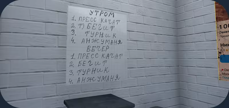 What to Expect in the Demo: Immerse yourself in the unique atmosphere of a solitary cell, where every detail tells its own story. You're surrounded by familiar objects — a bathtub filled with ice, dumbbells, and posters, all contributing to a constant sense of pressure and tension.