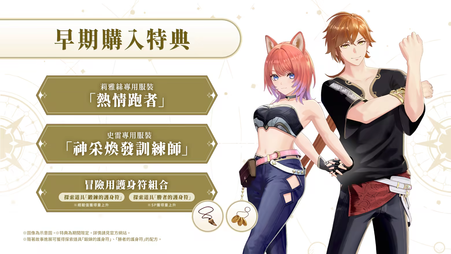可獲得莉雅絲與史雷的服裝各1種,以及冒險用護身符組合。