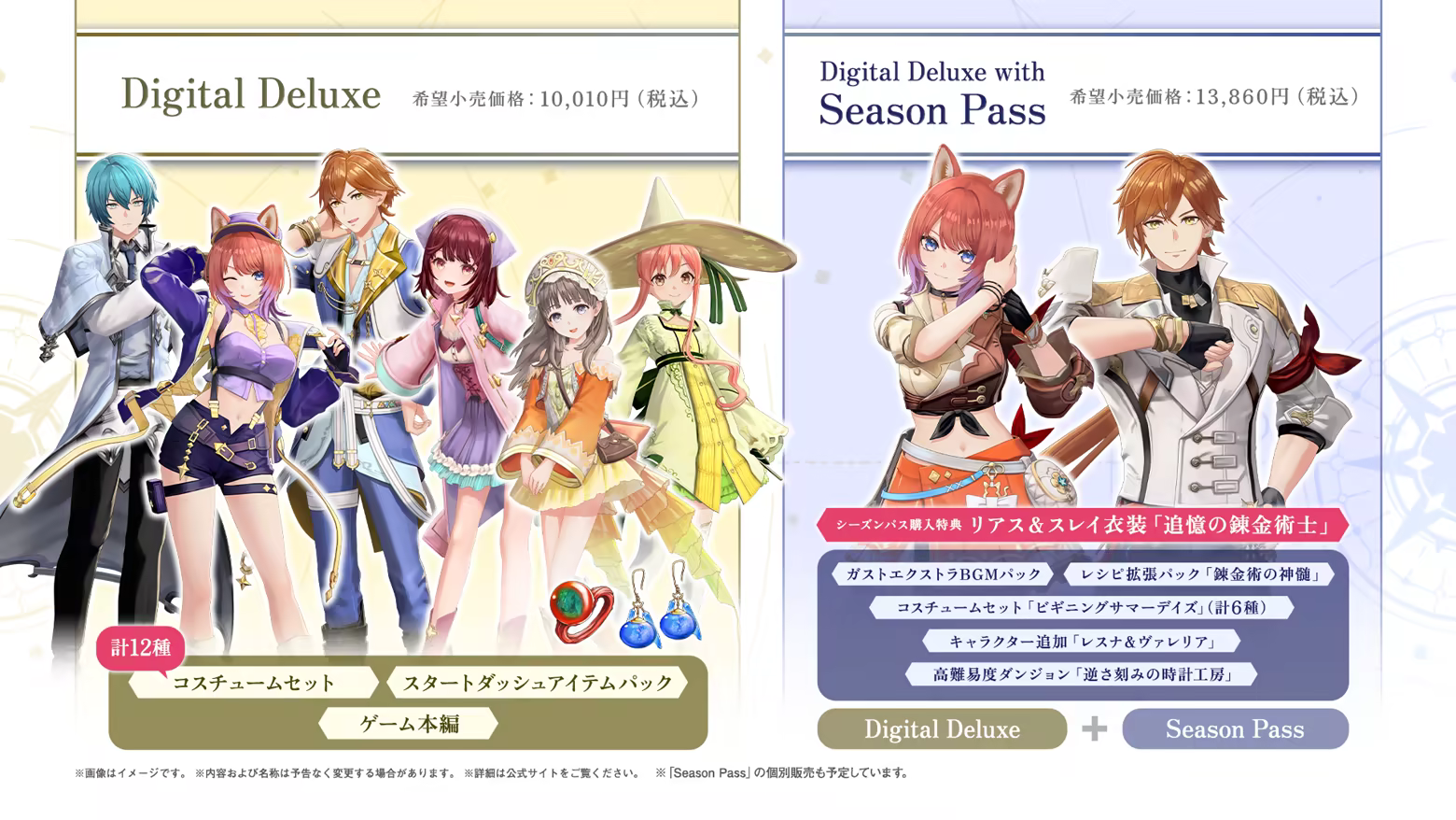 リアス、スレイ、ロゼ、ウィルベル、トトリ、ソフィーのアナザーカラーのコスチューム(各キャラクター2種類ずつの全12種類)と「スタートダッシュアイテムパック」のセット。