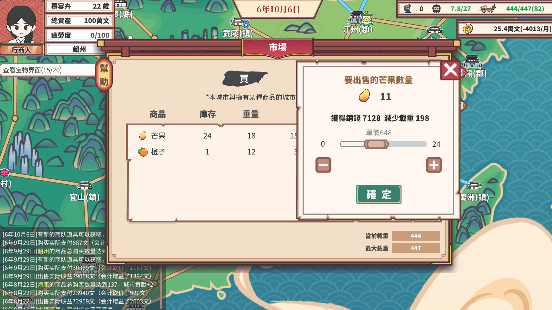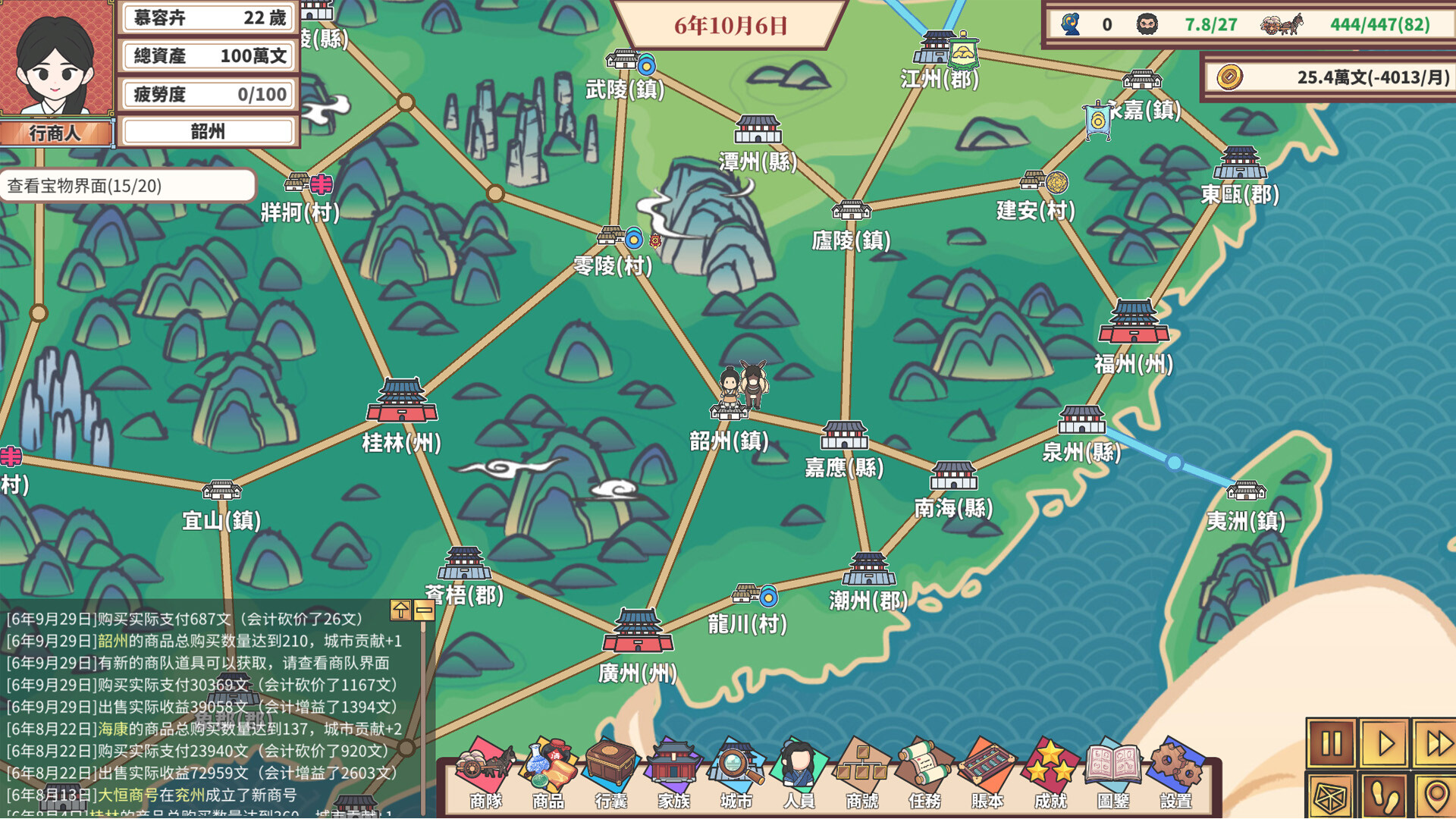 中華一商:傳承是一款模擬經營貿易游戲,背景設定在架空的古代中華地區,在游戲中,你可以從一無所有的窮伙計變成富甲天下的大商人。通過商品買賣、投資城市、完成商單、運營商號、管理家族,目標是最高榮譽的中華一商!