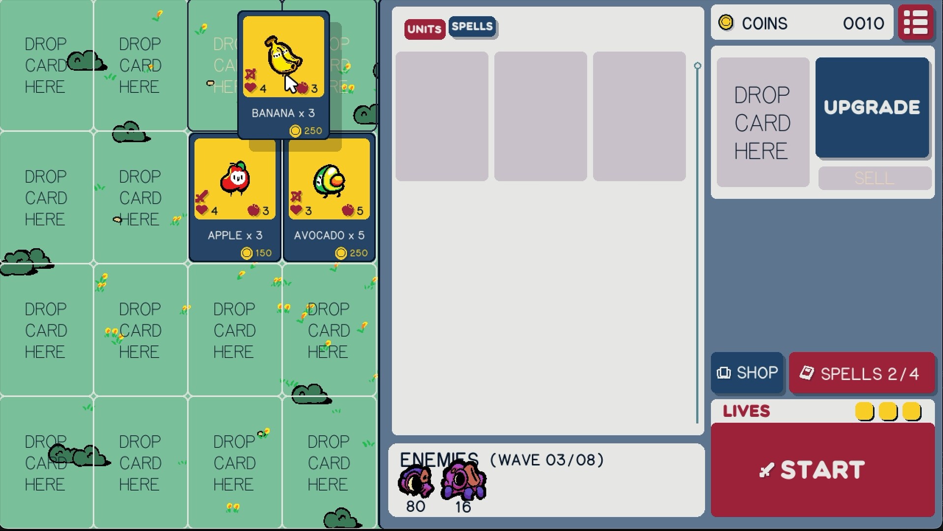 At the start of each round, you’ll spend coins to grab fruit or spell cards. Fruit cards summon little fruit warriors into battle. Spell cards let you zap stuff or boost your team mid-fight. Simple enough.