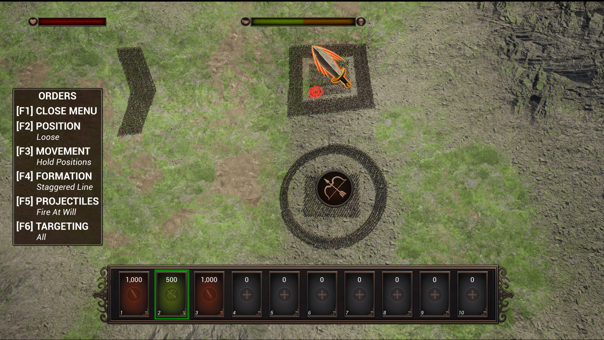 Formation control orders currently includes positioning, movement behavior, formation shape, projectile firing behavior, and targeting. More advanced control will be added alongside future additions to weapon classes (i.e. shields, spears, etc).