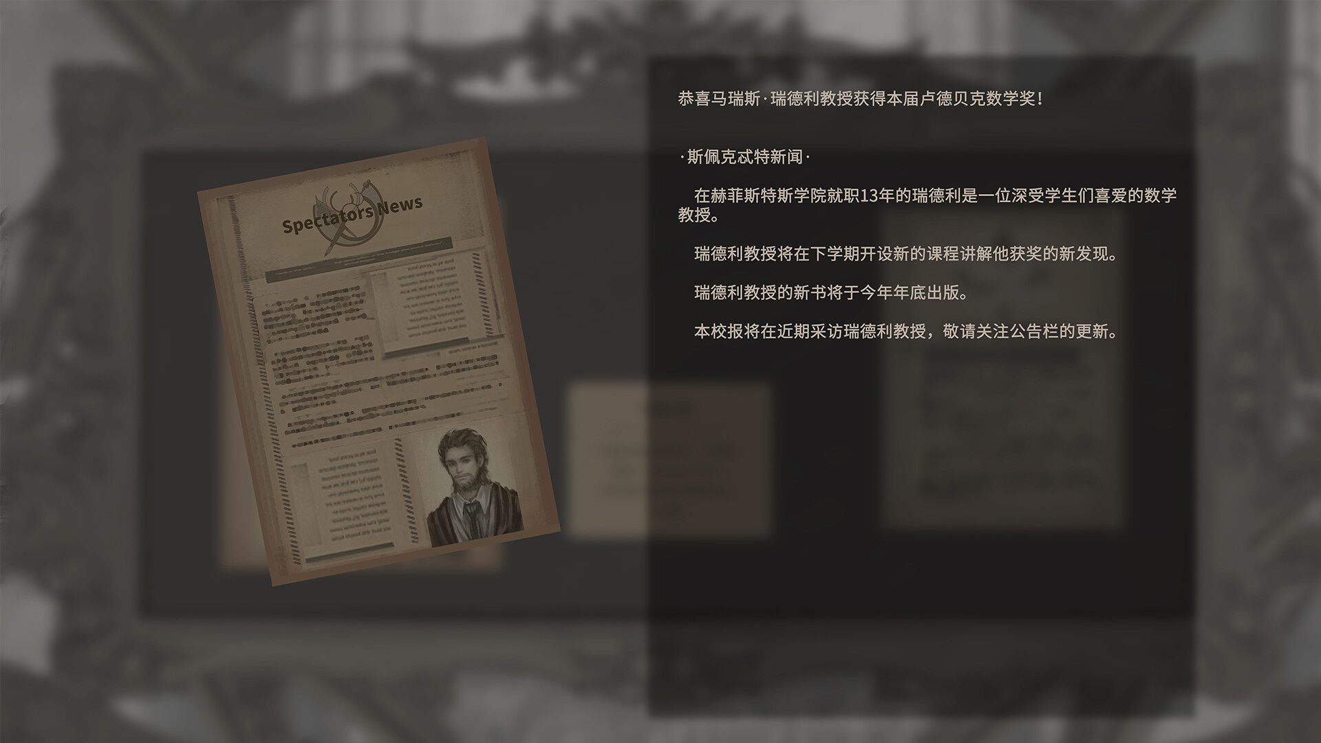 每天更新的公告栏上会报道事件发展的新消息,但也有着校内校外有趣的活动,还有学院不同社团的简介和招新,从中,你可以体验学院生活的丰富和乐趣。某些特殊的人在字条中的话语引起了你的共鸣,继续和对方交流下去,也许会有更深刻的关系可以得到发展。每晚回到宿舍时,可以查看当天收集所有信息,在图书馆打工获得的薪资也能被用来购买各种各样的装饰物件和空白字条。