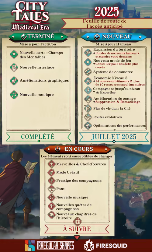 « City Tales: Medieval Era est un projet réalisé par une petite équipe et nous sommes passionnés par la création d'une communauté et par l'inclusion de ses commentaires tout au long du développement. Nous avons de nombreuses nouvelles idées à inclure et nous voulons nous assurer qu'elles sont mises en œuvre d'une manière qui soit significative pour nos joueurs. Nous pensons que l'accès anticipé offre le meilleur environnement pour que cela se produise. »