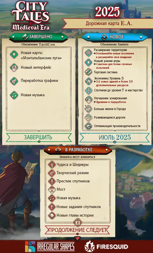 «City Tales: Medieval Era - это проект, созданный небольшой командой, и мы очень стараемся сформировать сообщество и учитывать его мнения в процессе разработки. У нас есть много новых идей, и мы хотим, чтобы они были реализованы именно так, как это будет интересно нашим игрокам. Мы считаем, что ранний доступ обеспечивает наилучшие условия для этого.»