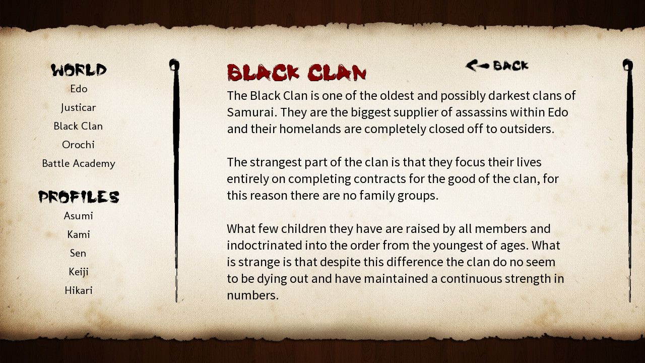 Enter Asumi - A female samurai of the black clan, trained from birth to kill on command. Now newly appointed as a Justicar of Edo. Our protagonist finds herself in a place she never thought she would be, outside of the shadows, within an academy, trying to root out a rebel before civil war can engulf Edo and its people.