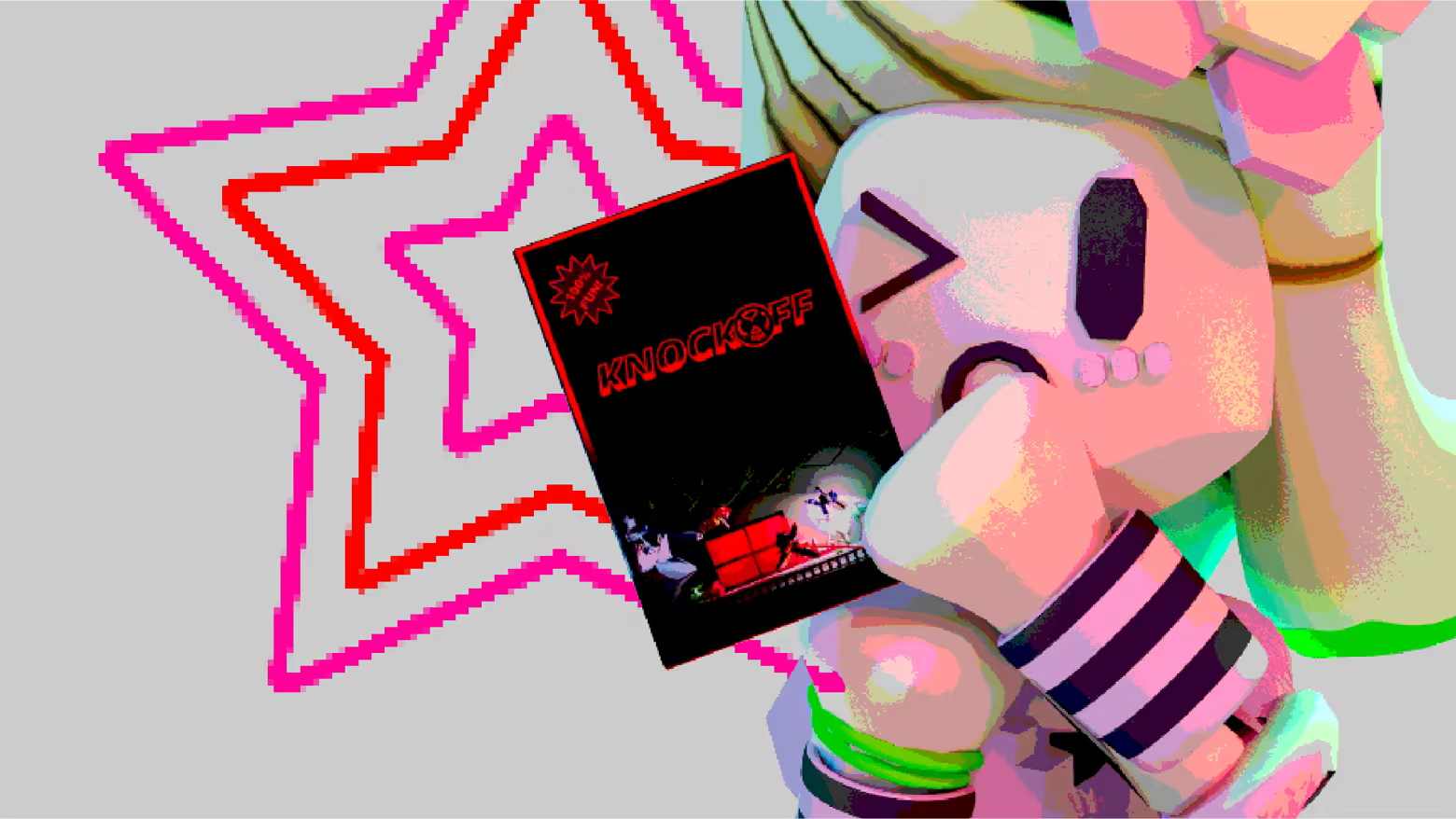 KNOCKOFF is made without generative A"I". It features only the real art of real humans and real catboys. Alongside my 3D models, animations, stages, and pixel art textures and code, it features some of datamosh videos, a radical original soundtrack, and iconic drawings of my dearest friends.