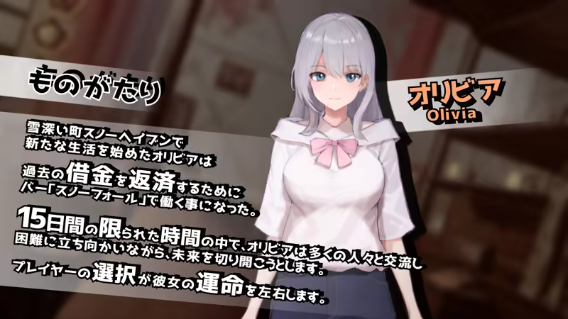 "Under the City Lights" is a simulation game where the story changes significantly based on the player's choices. Set in the snowy town of "Snowhaven," the game takes place in the bustling bar "Snowfall," where the fate of the heroine, Olivia, is in your hands. She has come to this town to repay her debts, but her future depends entirely on your decisions.