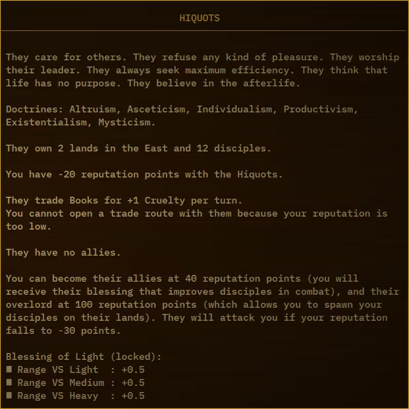 In RoH, resources serve a dual purpose: they reflect your moral decisions and determine your ability to construct buildings. For example, boosting your Health resource not only prepares you for health-related events that occur each turn, but also enables you to recruit specialised disciples and build structures like Farms or Quarries. Conversely, a deficiency in Health, or an excess of Cruelty or Vanity, can have significant repercussions.