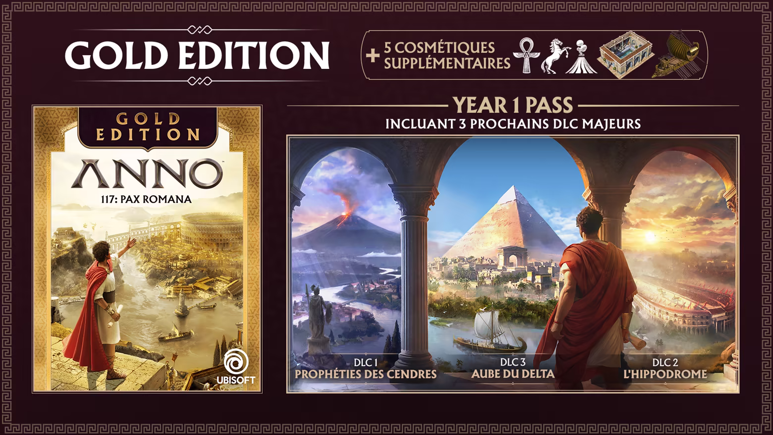 Dans la Gold Edition, accédez au jeu de base Anno 117: Pax Romana et étendez votre empire vers de nouvelles provinces grâce au Year 1 Pass, avec à la clé 3 DLC et 5 cosmétiques bonus !