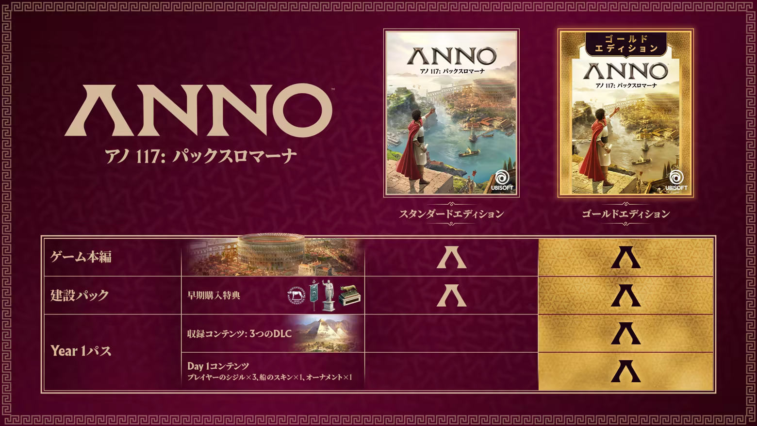 ゴールドエディションで、ローマ帝国の属州をさらに拡げよう! 『アノ 117: パックスロマーナ』ゲーム本編に加えて、3つのDLCと5つのコスメティック特典を収録した「Year 1 パス」が同梱!