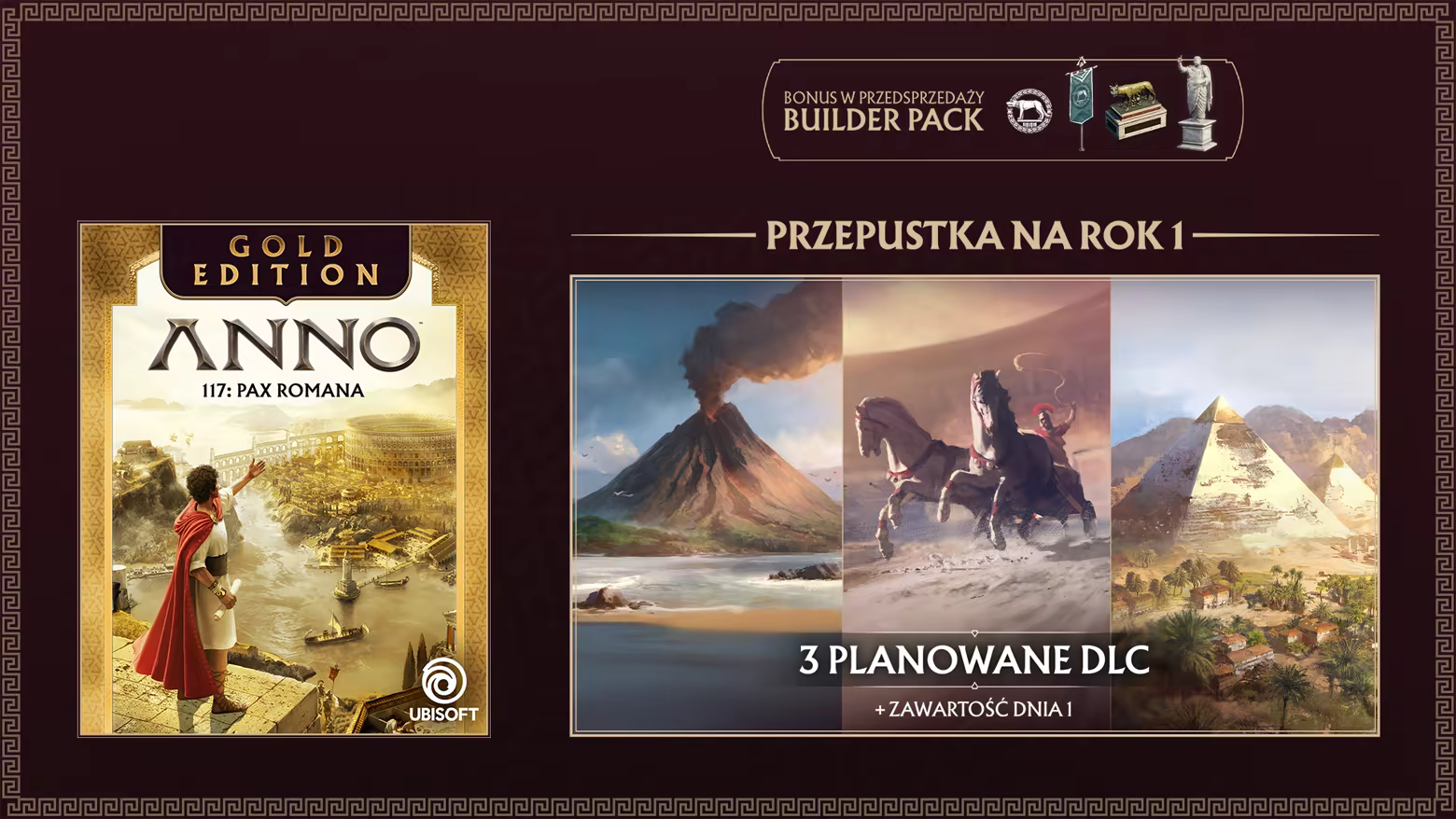 Wraz z Gold Edition zyskujesz dostęp do podstawowej przygody w grze Anno 117: Pax Romana i rozszerzasz swoje możliwości o nowe prowincje w ramach Przepustki na Rok 1, która obejmuje 3 dodatki DLC oraz 5 dodatków dekoracyjnych!