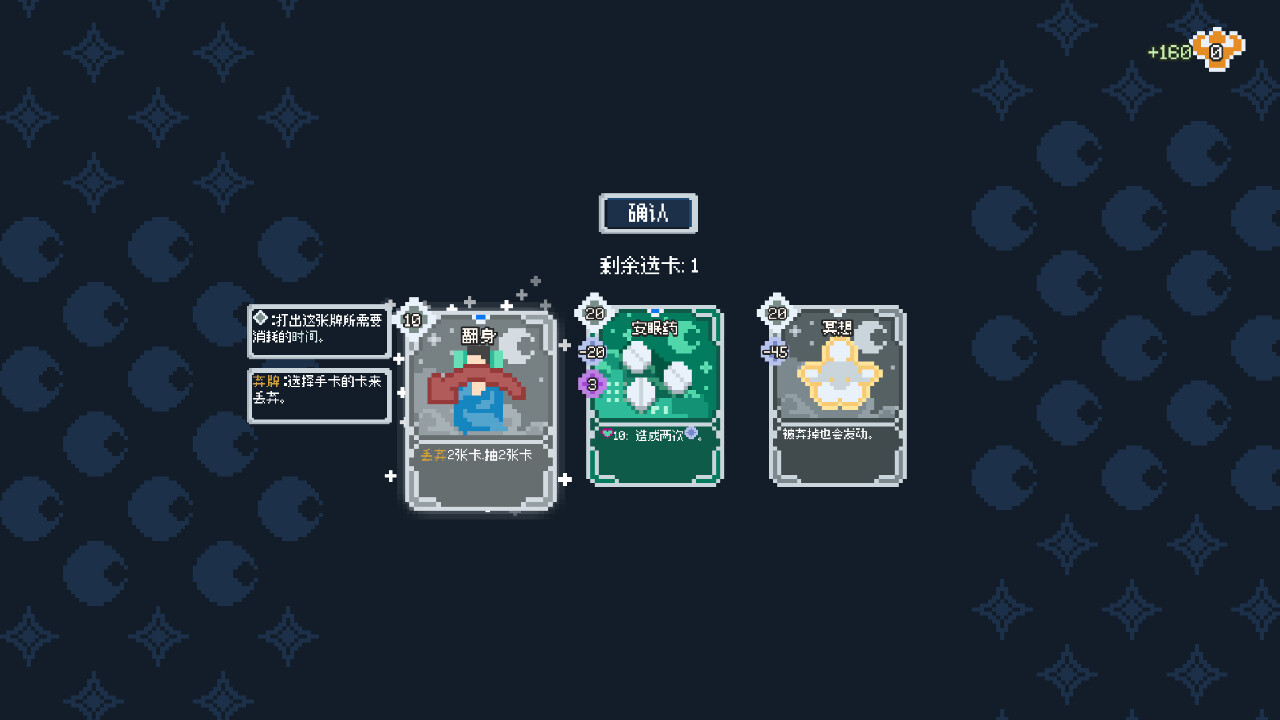 在夜晚打出各种卡牌来尽快入眠,在白天进行各种行动来强化卡组。调配卡组和备牌来构筑最棒的卡组,战胜失眠!