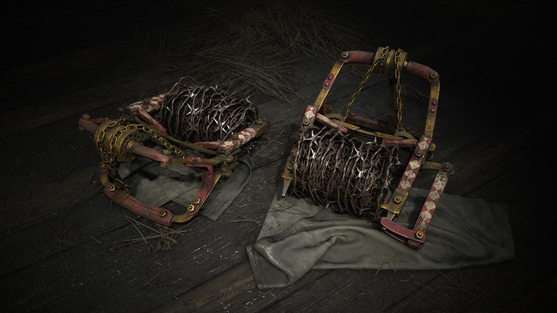 Something in an animal’s stare can change the heart of even the cruelest men. This Concertina Bomb was used by Harlan Grant to ensnare a hyena. A glint in the beast’s gaze softened him on the hot savannah, and he turned prey into pet.
