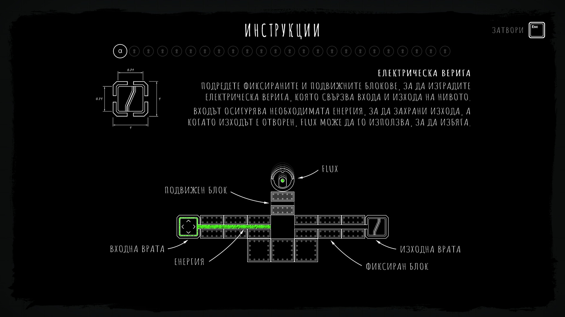 Помогнете на Flux, роботът-прахосмукачка, да премине всички нива, като изградите енергийната верига, която захранва изходната врата. Задачата може да изглежда проста, но сложността на пъзелите ще постави на изпитание вашата пространствена ориентация, абстрактно мислене и аналитични умения до краен предел.