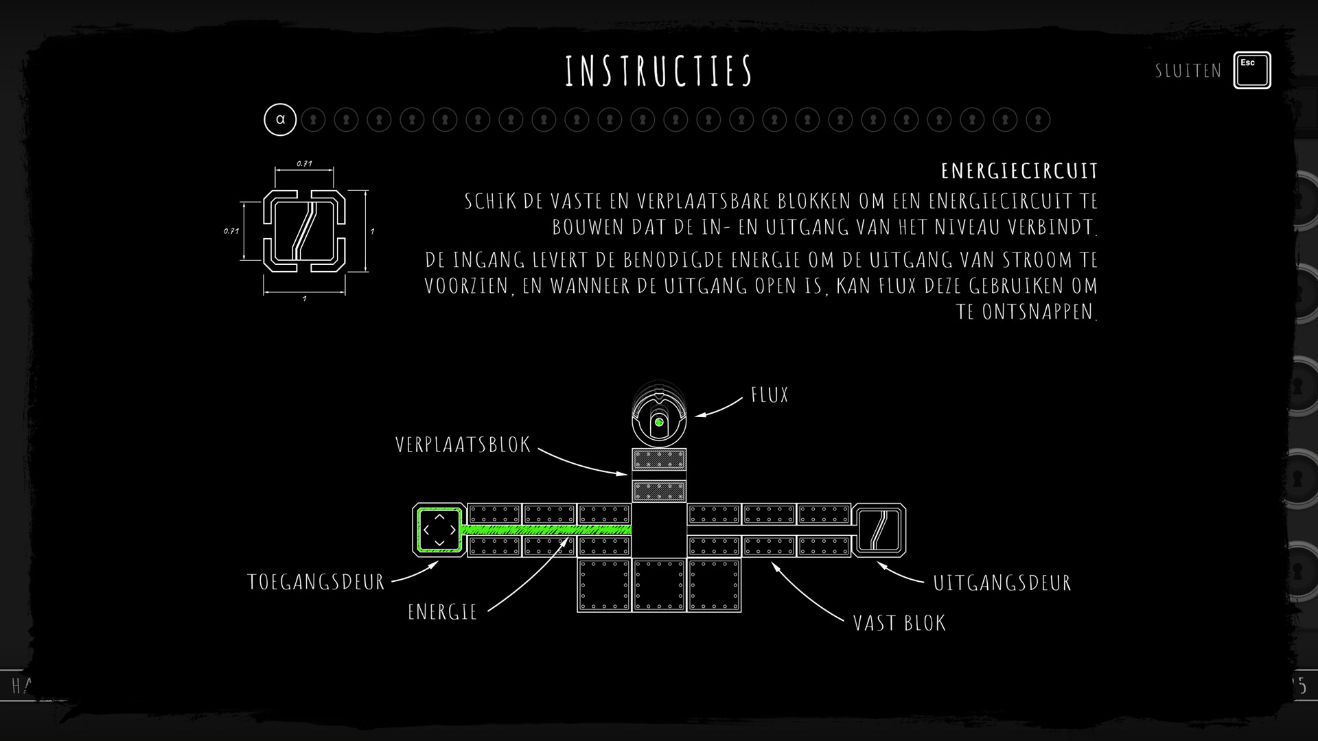 Help Flux, een robotstofzuiger, om ieder level te ontsnappen door het energiecircuit te bouwen dat de uitgang van stroom voorziet. De missie lijkt misschien eenvoudig, maar de complexiteit van de puzzels zal je ruimtelijk inzicht, abstract denkvermogen en analytische vaardigheden tot het uiterste testen.
