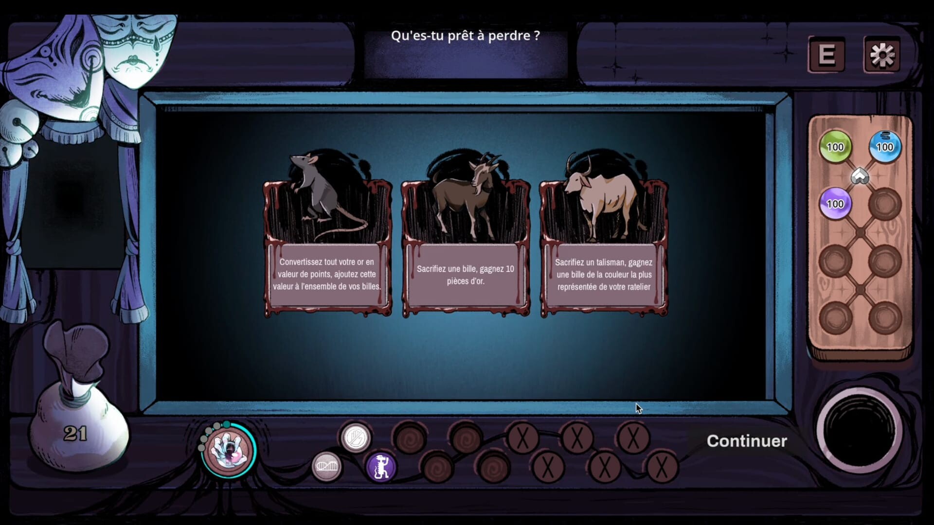 Carnaval Marbles est la fusion d’un roguelike systémique et du billard français. Dans un monde de dark fantasy carnavalesque, chaque tir compte : le positionnement, les rebonds et les synergies entre vos Talismans, Bonus de billes et Runes transforment une simple partie de billard en une véritable machine combinatoire. Jamais deux runs ne se ressemblent.