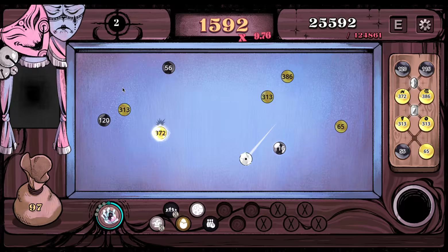 Carnaval Marbles unisce un roguelike sistemico al biliardo francese. In un mondo dark fantasy carnevalesco, ogni tiro conta: posizionamento, sponde e sinergie tra Talismani, Bonus Biglia e Rune trasformano una semplice partita in una vera macchina combinatoria. Nessuna run è uguale all’altra.