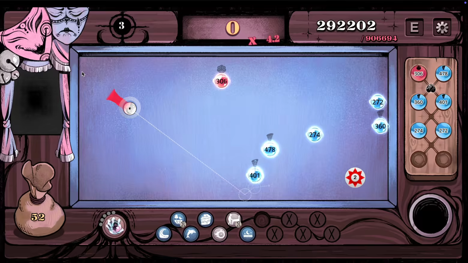 Carnaval Marbles はシステミックなローグライクとフランス式ビリヤードの融合です。カーニバル調のダークファンタジー世界で、一打一打が勝負を分けます。配置、クッション、そしてタリスマン/マーブルボーナス/ルーンの相互作用が、シンプルなビリヤードを本格的な組み合わせエンジンへと変貌させます。同じランは二度とありません。