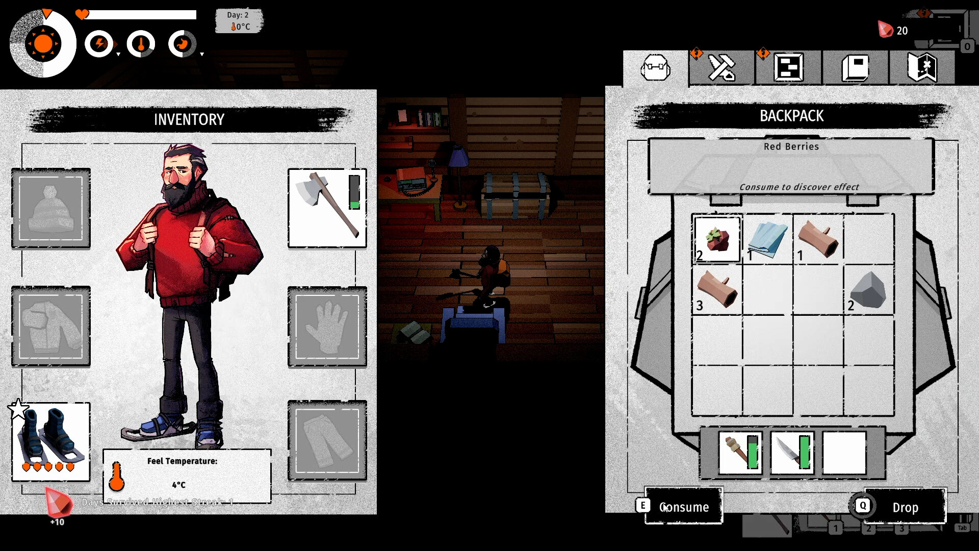 • Scavenge and endure: Search abandoned cabins, fish in icy waters, and cut wood to survive the cold.