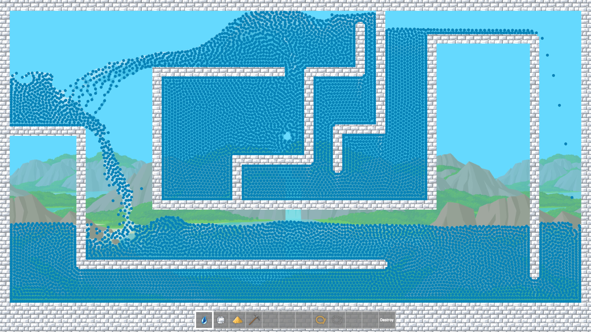 Explore the elements of Fractala Sandbox and its large-scale physics-based simulation. A pure sandbox experience featuring everything from wavy water and sticky slime to viscous lava, coiling honey, squishy jelly, compressible snow, piling sand, aerodynamics, solids, rope, fire, and explosives!