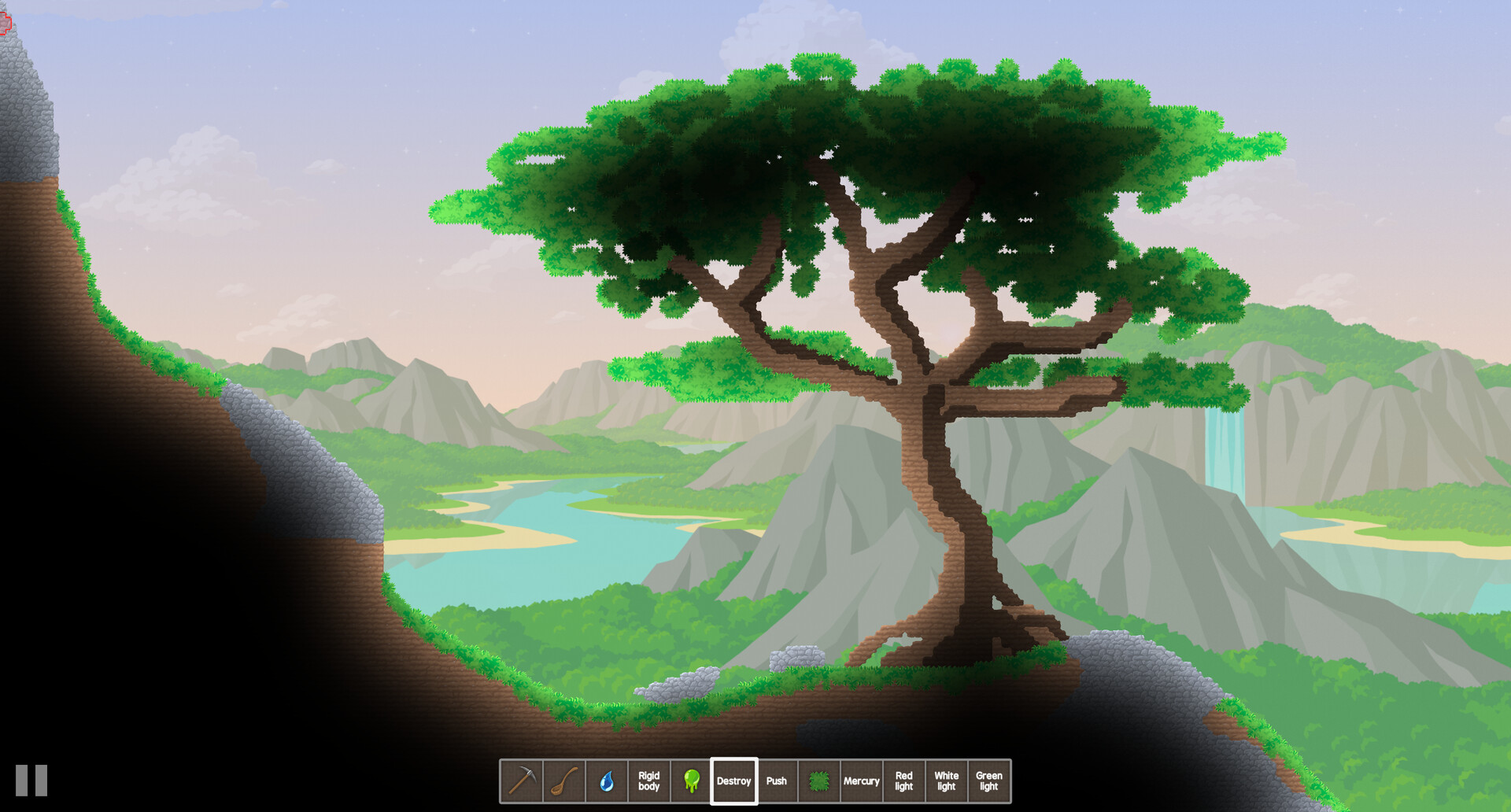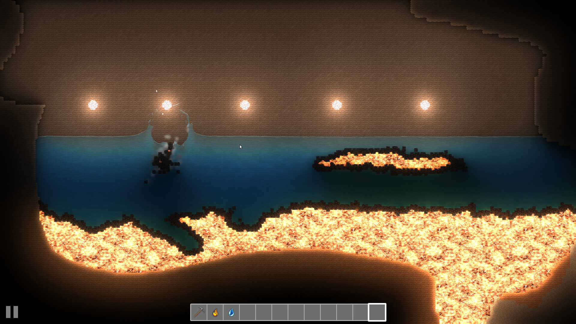 The sandbox aims to spark player creativity through its highly interconnected simulation, leveraging the graphics card to simulate vast quantities of particles in real-time. Experiment with different materials, discover unforeseen reactions, and use your findings in a larger contraption. Or tinker with items and combine them to make a pretty diorama.