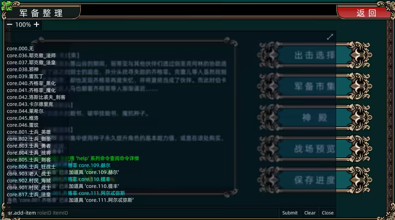 内置控制台主要用于模组制作者们测试, 当然你也可以用来爽玩! 可以随意提升等级, 添加想要的物品, 哪怕是正常途径无法获得的物品! 甚至还可以任意改变阵营, 让神将哈萨加入我方会怎样呢 ? 这一切就看你的了 !