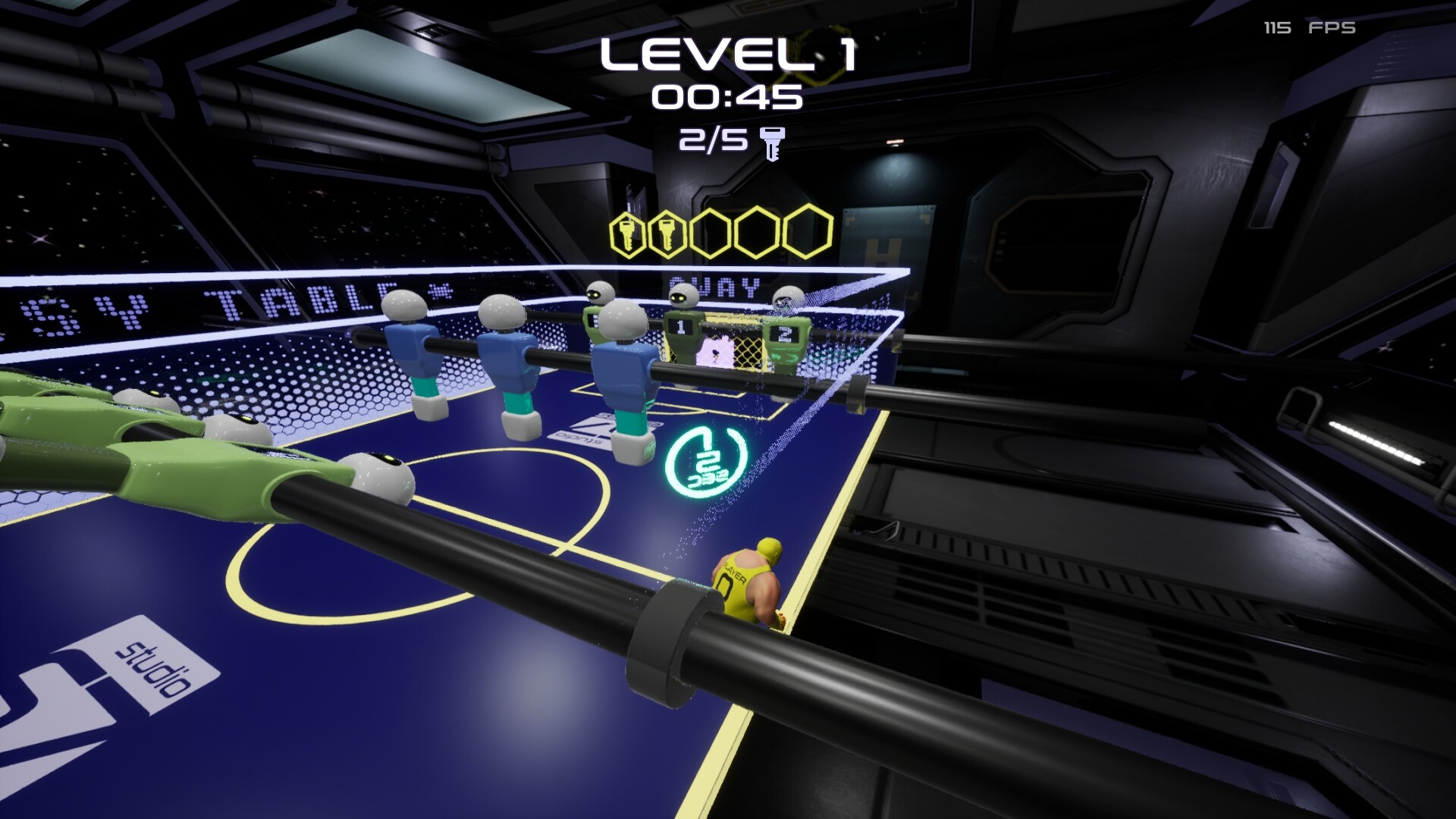In Foosball Runner, you are not just playing the game; you are the game! Set in the sleek halls of a spaceship, this unique twist on table football puts you in the role of a plump footballer navigating dynamic tables. Dodge spinning figures, collect keys, and race against time to unlock gates and score big.