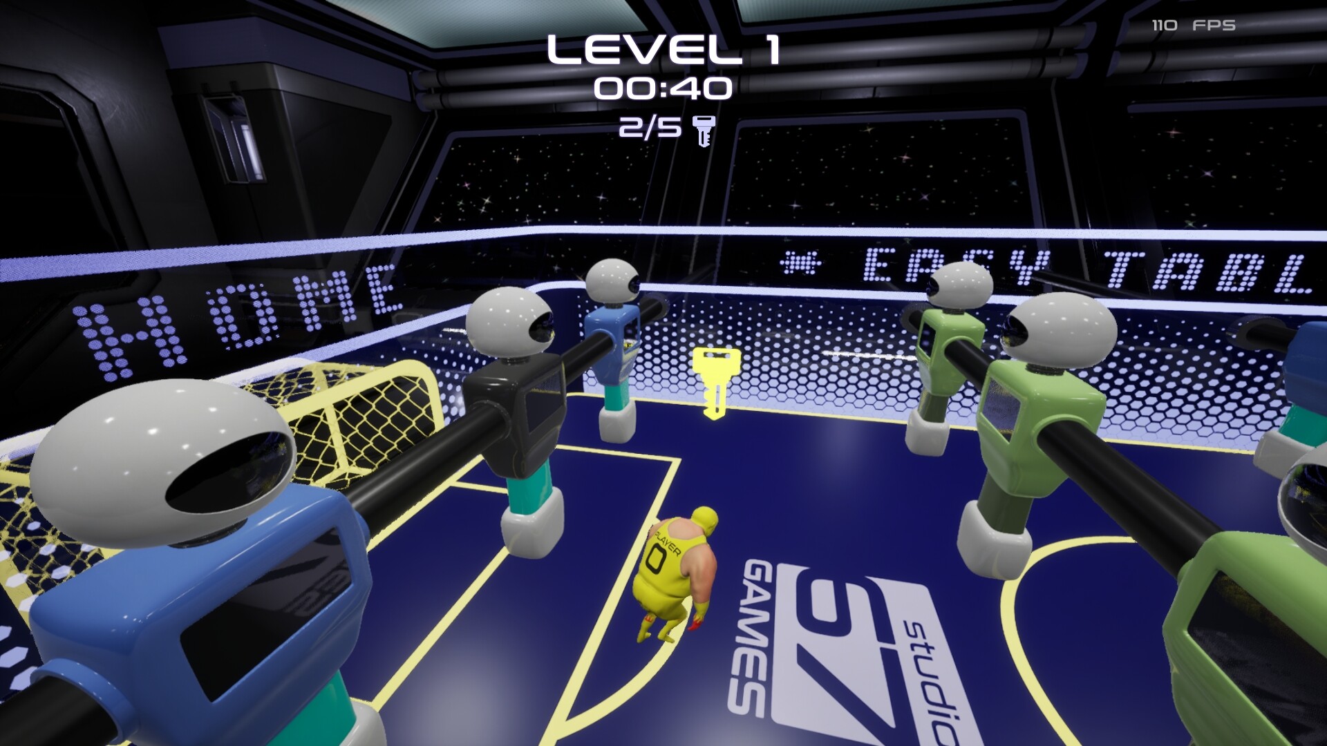 Experience the excitement of controlling a rotund footballer as you sprint through vibrant, futuristic tables. Your mission: collect five visible keys scattered across the table within one minute. As you dash around, avoid the spinning figures that get faster and hit harder with each level. Unlock the gate with the keys and roll in to score under a minute!
