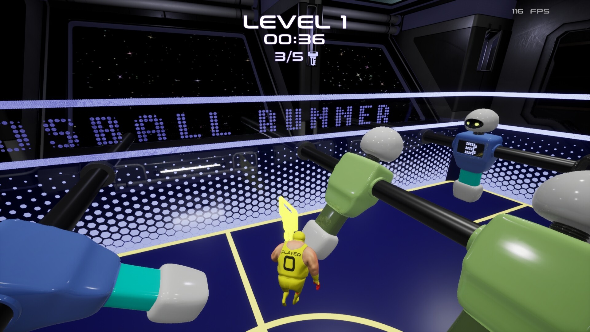 Foosball Runner features sleek, futuristic graphics that immerse you in a high-tech spaceship environment. The fun, quirky audio includes humorous character dialogues and funny pain sounds when the character gets hit, adding a playful charm to the game. Energetic music keeps the adrenaline pumping as you race against time to collect keys and score.
